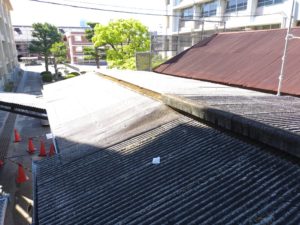 食堂の屋根瓦を一部撤去し、在来の波トタンの上にガルバニウムのカバー工法としました。