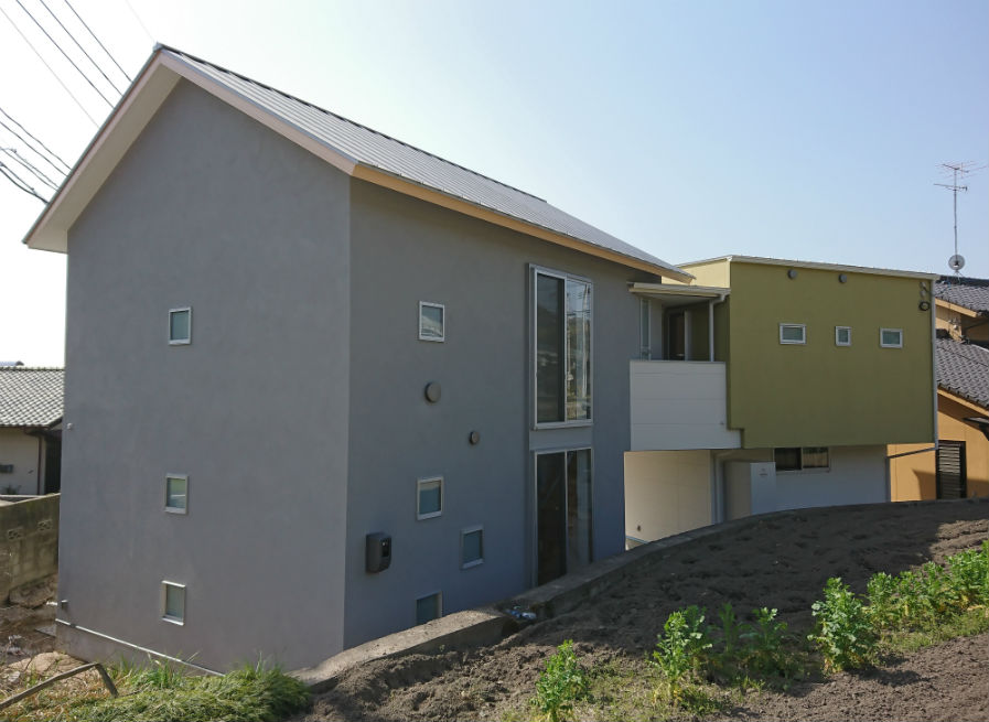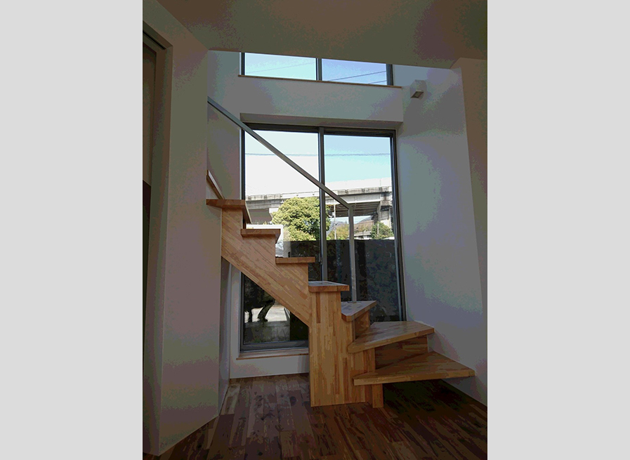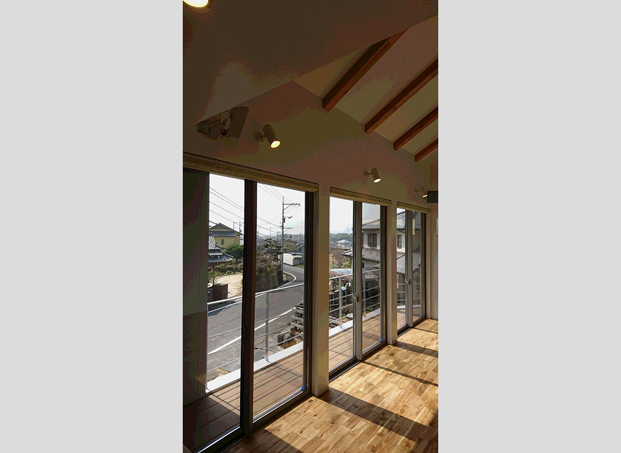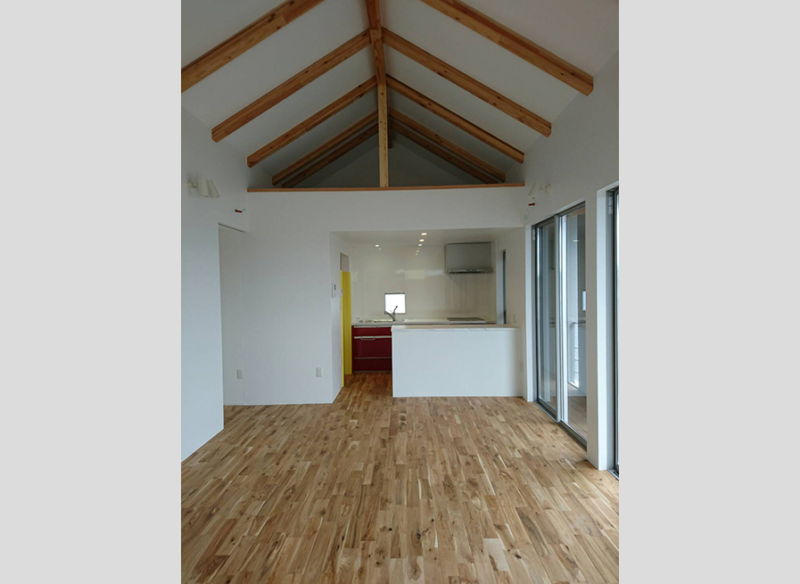 2階にリビングがあり、勾配天井を活かした明るく開放的な家です。